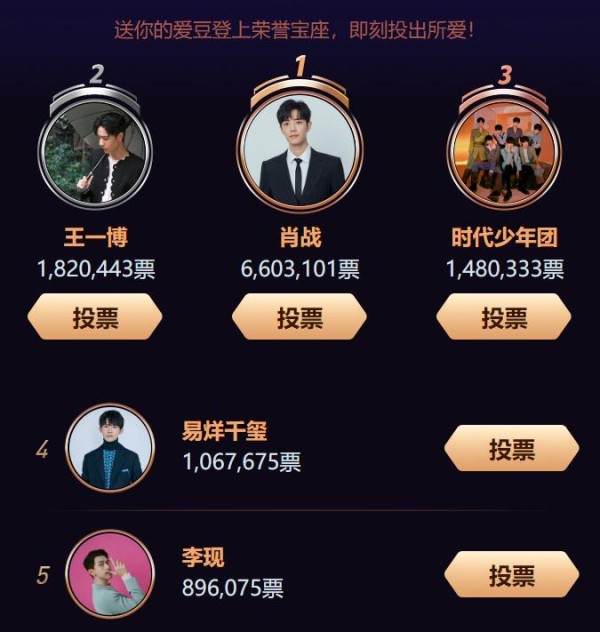 “微博之夜”投票活动中,有很多个奖项,微博King这项投票中,肖战拿到了660万票,位居第一名,而同为顶流明星的王一博,只有182万票,看来顶流之间也是有不小的差距。