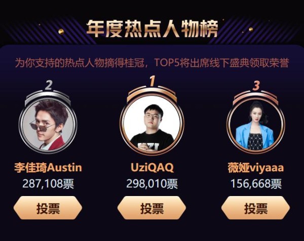 电竞圈VS娱乐圈,UZI再度反超王一博,前10名有4位电竞选手微博之夜年度热点人物榜:Uzi暂列第二,力压李佳琦、薇娅