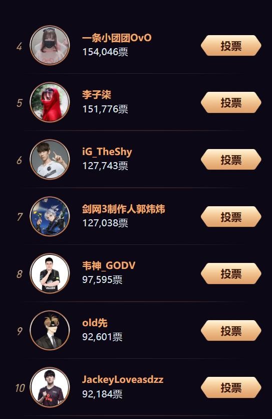 没想到如今1年时间过去了,UZI已经退役,但他的人气丝毫不减,目前获得了289010票位居第一,由此可见,UZI的人气一点儿也不输一线明星,如果UZI最后获奖的话,不知道今年能否出席微博之夜线下盛典呢?