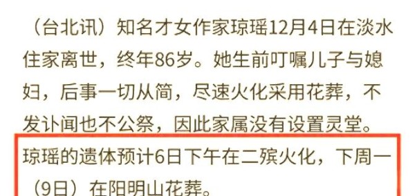 临别之际,琼瑶深情寄语:“永远爱你们,别为我哭泣。”然而,这样的告别怎能抚平林青霞内心的悲痛?毕竟,这不仅意味着一位师长的离世,更象征着半个世纪亦师亦友深厚情谊的终结。如今,琼瑶的遗体已在12月6日于二殡火化,她将与挚爱平鑫涛于12月9日在阳明山合葬。这位为华语影视界培育出众多杰出演员的传奇女作家,终于能与挚爱团聚。她留给世人的,除却不朽的文学巨作,更有林青霞这样一位深切缅怀她、见证其辉煌人生的“琼女郎”。