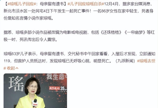 86岁琼瑶轻生原因揭秘,苏有朋、黄晓明、范冰冰发文深切悼念