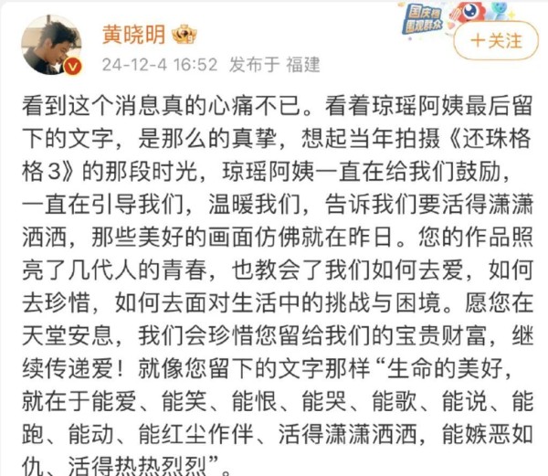 他的文字间流露出深深的敬意和感激之情。在黄晓明的人生演艺历程中,琼瑶宛如一盏指路的明灯。然而,她的离世,对于黄晓明而言,仿佛是那盏灯的熄灭。但他的悼念之词,又赋予了这盏灯新的生命意义。