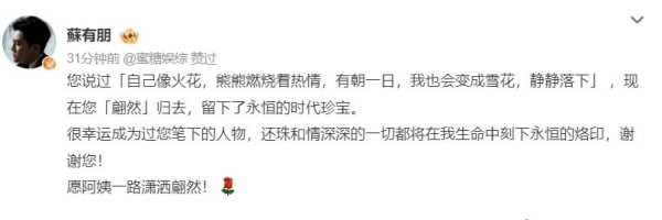 范冰冰悼念琼瑶,尊重其选择并永远铭记