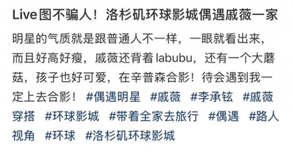 1 月 24 日的洛杉矶环球影城,阳光明媚,熙熙攘攘的人群中充满了欢声笑语。一位幸运的网友在游玩过程中,不经意间发现了一道熟悉的身影。定睛一看,竟然是戚薇李承铉一家四口。这位网友抑制不住内心的激动,迅速拿出手机,记录下了这难得的瞬间。
