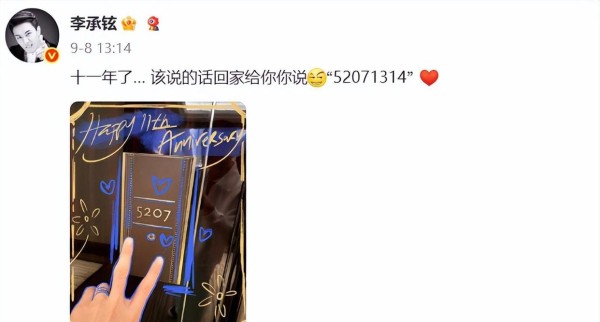 9月8号,是戚薇和李承铉结婚十一周年纪念日,当天李承铉准时发文告白戚薇:十一年了,想说的话回家再跟你讲,52071314。真心话,甜得让人羡慕啊。