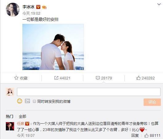 去年李冰冰公开了与小16岁男友的恋情,而自认是媒人的任泉当时还送上了祝福,从此,“冰泉”的友情在娱乐圈被传为佳话,其实他们之间的感情,说没有一丝暧昧也是假的,大约是友情至上、恋人未满的程度。