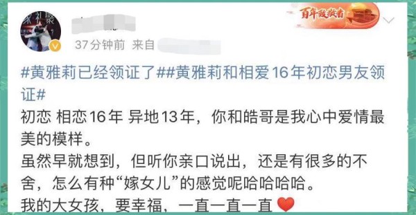黄雅莉官宣与相恋16年男友领证结婚,男方身份曝光:是湖南台导演