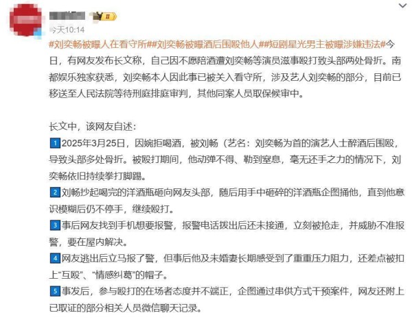 事情还要从三月份说起。某个“社交场合”,据说刘先生递了杯酒给一位“圈里人”,对方不愿陪酒,这下刘某立马上头——把人当助兴道具看待,结果被泼冷水。人家婉拒,他非但没作罢,反倒觉得是天大的没面子。东北有话咋说的?“你看不上我,我还真不乐意了!”一气之下,直接操起酒瓶就往人家头上招呼,这也太吓人了,搞什么“江湖规矩”那一套?把和气饭局生生升级成犯罪现场,暴力一顿秀操作,结果头都砸骨折了。这还不算,刘先生继续追击,眼镜都揍歪了都没停手。幸好没得逞,否则结局怕不是“蹲监狱”那么简单。这一茬又一茬,吃瓜群众纷纷表示,被刷新三观说好的娱乐圈、文艺圈,结果成了“动作片拍摄地”。而且暴力之后刘先生还抢走手机,不让人报案,这已经不是“偶像人设崩塌”这么简单,这老底子扒得让人尴尬。普通人咋看?有网友吐槽“出名就能无法无天?法外狂徒薅过来给你当师父吧?”有更理性的说“艺人需不需要更严格的道德准绳?”这一波发言,堪比社会版专栏点评。