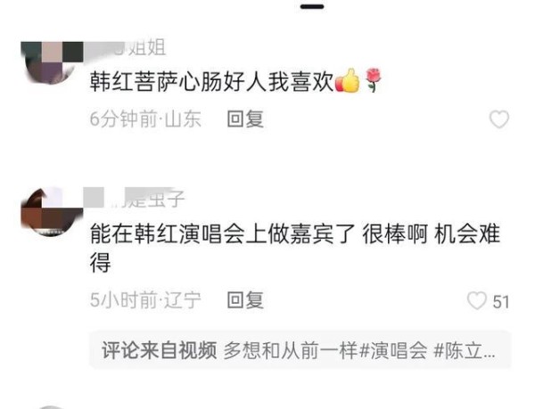 演唱会当晚,韩红刚唱完经典曲目《天亮了》,气喘吁吁地拿起话筒笑说:“今天要给大家带个‘小惊喜’,我关注这孩子很久了,他的歌声里有股干净的劲儿。”话音刚落,陈立农穿着简单的白色衬衫从侧台走出,看到韩红时下意识鞠躬的样子,像极了晚辈见到前辈的紧张又兴奋。