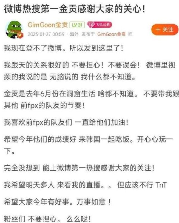 金贡支持doinb后被围攻,公开发文解释,称自己和小天关系很好