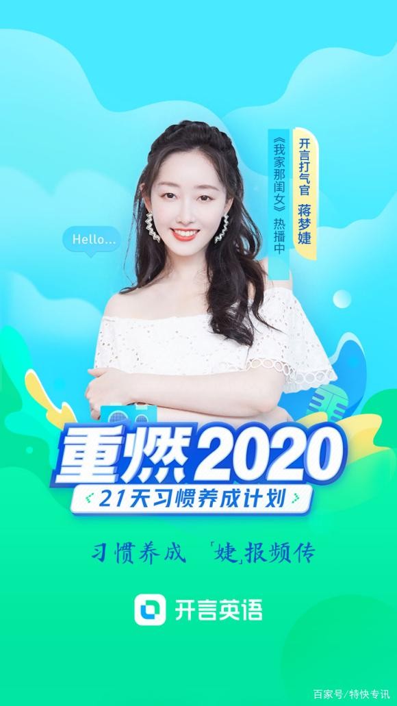 其实,有着海外留学经历的蒋梦婕英语能力非常强,多年前流传于网络上的英语配音视频就让广大网友们见识到了她纯正的发音。在电影《蒸发太平洋》中,蒋梦婕熟练的英语台词也让其圈粉无数。这样出色的英语能力背后,是蒋梦婕刻苦练习的结果。在出演《在纽约》时,为了几段英语台词,蒋梦婕从白天练到了晚上,直到自己满意为止。在开言英语“重燃2020”21天习惯养成计划中,蒋梦婕也是同自己的自律激发用户和粉丝,帮助他们一起坚持,一起提高,一起进步。