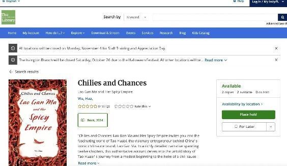 《老干妈和她的辣酱帝国》英文版被美国印第安纳波利斯公共图书馆收藏