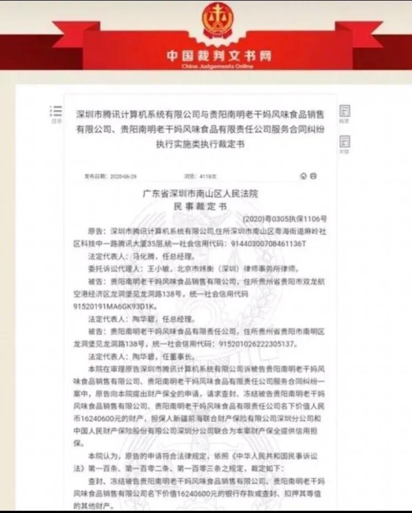同时腾讯公司已向广东省深圳市南山区人民法院申请冻结了被告方贵阳南明老干妈风味食品销售有限公司、贵阳南明老干妈风味食品有限责任公司名下价值人民币1624.06万元的财产。