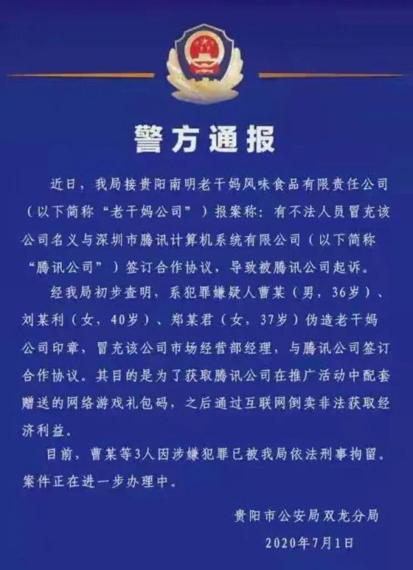 就在大家猜测谁在说慌时,今天下午,贵阳警方通报来了。原来这次的案件竟是有三个人用萝卜雕刻了老干妈的印章,冒充老干妈市场经营部经理的身份与腾讯公司签订的合作协议。出人意料的是,这三人伪造合同的目的是为了获取腾讯推广活动的网游游戏礼包,然后倒卖获利!