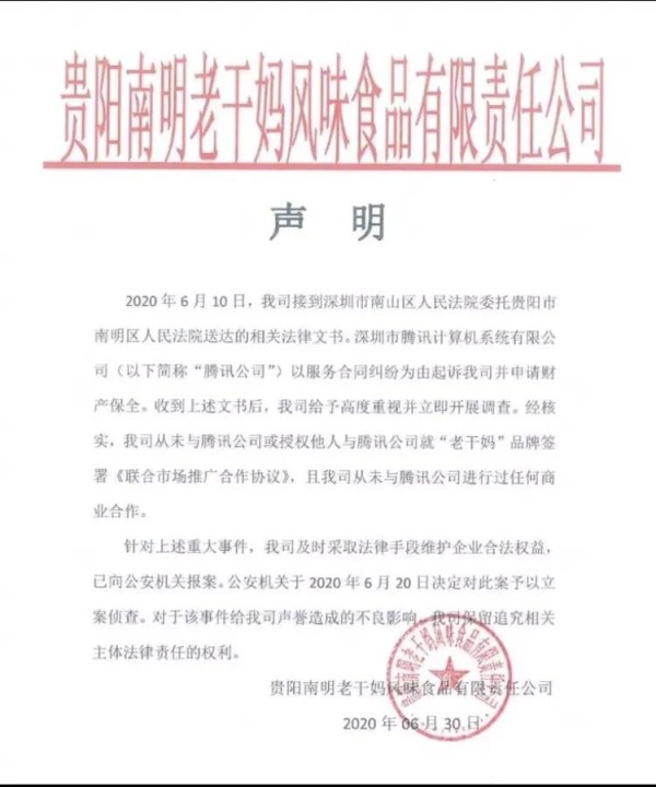 老干妈:经过数日深入沟通,已与腾讯厘清误解 — 新京报
