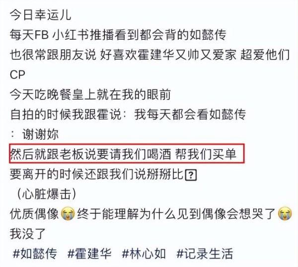 4月14日,有网友在社交平台分享出偶遇林心如霍建华夫妇动态,因《如懿传》而被霍建华圈粉的网友看到真人后十分欣喜,主动上前打招呼,而霍建华在得知网友是她的剧粉后不仅痛快答应合影,还大方请粉丝喝酒帮买单,与老婆林心如离开餐厅时不忘与粉丝告别,完全没有大明星架子,亲和力满分。