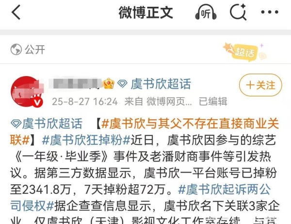 8 月 27 日,一则 “虞书欣与其父亲未存在直接商业关联” 的新闻悄然上线。
