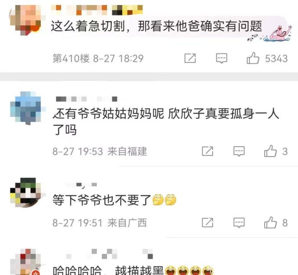 评论亲情切割的这一波网友,有人说:这么着急切割,说明她父亲确实有问题。有人说:还有爷爷姑姑妈妈,难道欣欣子要孤身一人吗?还有人说:越描越黑。