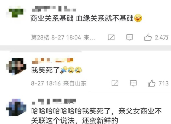 评论商业关联这类网友,有人说:商业关系基础,血缘关系就不基础。有人说:亲父女商业不关联这个说法,蛮新鲜的。
