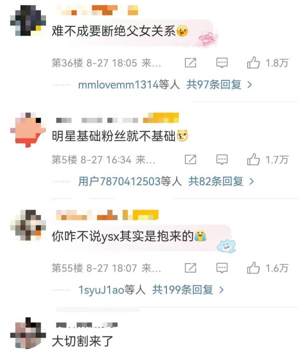 有人猜测:难道要脱离父女关系。有人说:明星基础,粉丝就不基础。有人提问:你咋不说ysx是抱来的。