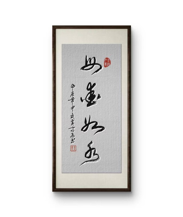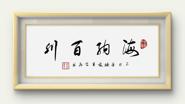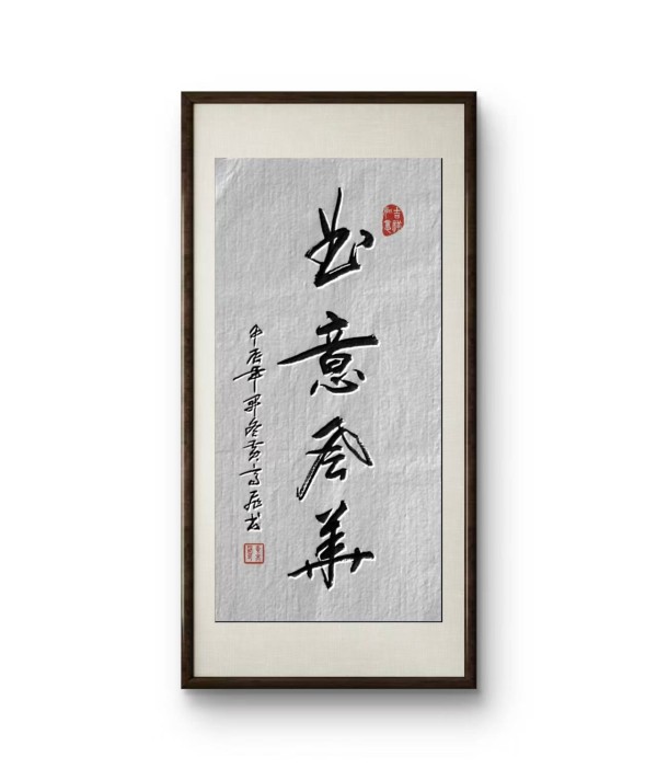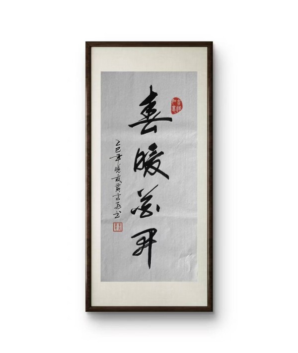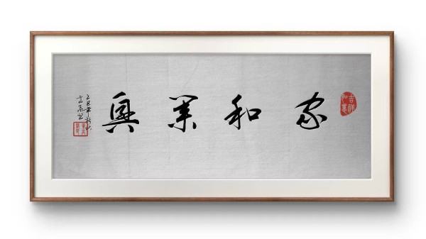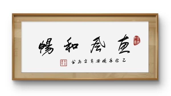 首先从整体构图来看,四字横向排布,简洁中见端庄,留白得当,视觉上颇具古典的留白美学。中部主字占据画面核心位置,两侧印章与落款自然围合,使整个画面形成“虚实相生、动静有致”的格局,充分体现出书法作品应有的呼吸感与节奏感。