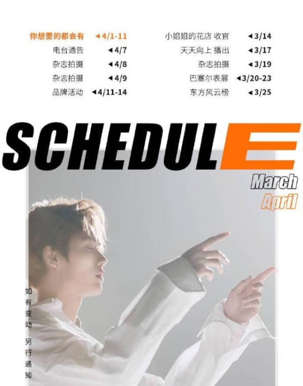 也列出了其他艺人的四月行程图,就不再一一介绍,若漏掉了你家爱豆可以在评论区提出,将努力补上。喜欢文章记得点赞和互粉哦