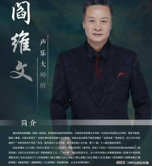 阎维文演唱的歌曲铿锵有力,斗志昂扬,催人奋进,尤其军旅歌曲有很强的感召力和广泛传唱度。阎维文曾经获得过央视青歌赛民族唱法冠军,多年演唱生涯有很多代表作,比如《望月》《母亲》《一二三四歌》《小白杨》等。阎维文是中国音乐学院博士生导师、中央音乐学院硕士生导师,既有歌唱实力也有理论水平,开办声乐培训班绰绰有余。