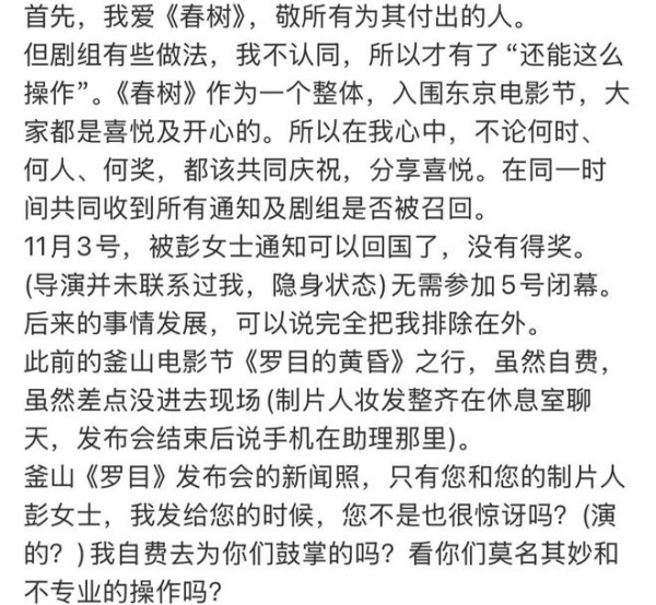 可事实并非如此,在11月3日的时候,白百何被彭女士通知可以回国了,原因在于她没有获得东京电影节最佳女主角奖,所以也没必要继续等候参加闭幕仪式,导演没有通知白百何,处于隐身状态。