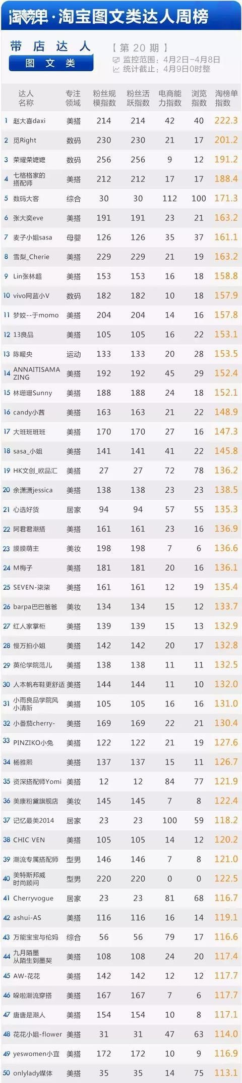 淘榜单联合淘宝官方共同发布淘宝图文类带店达人榜第20期,本期榜单统计时间为4月02日0时整至4月08日24时整。