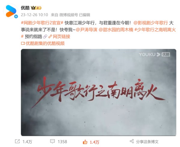 优酷与周木楠的合作始于一个武侠遇冷的市场环境。在古偶作为头部品类的背景下,优酷仍然看中了这片少年江湖的巨大潜力,大胆启动周木楠担任剧集编剧,选用一众新人演员打造了《少年歌行》,让无数观众记住了这份独属于少年武侠的浪漫。