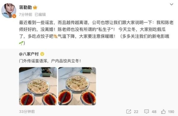 蒋勤勤陈建斌没离婚,女方否认有私生子,男方甜蜜晒饺子!