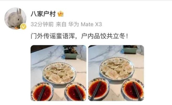 陈建斌晒出了两人共吃一碗饺子的照片,并配文:“门外传谣蜚语浑,户内品饺共立冬”,表现出两人的恩爱和默契。