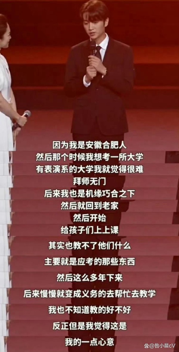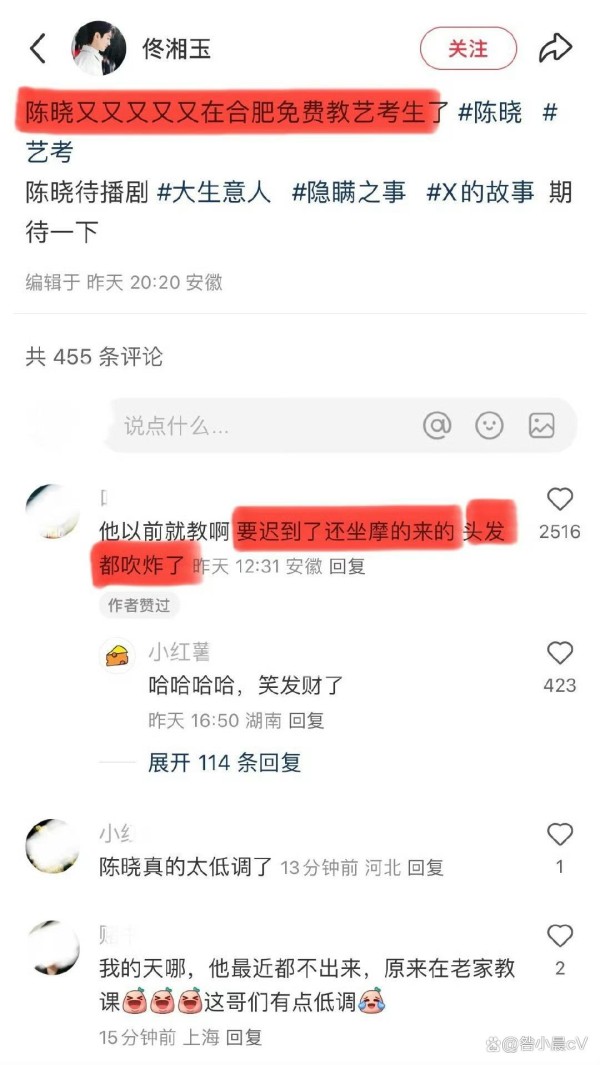 事件曝光后,“陈晓 艺考老师”话题冲上热搜第二。网友翻出他2023年作为文艺志愿者的发言:“当年在合肥求学时,多希望有个老师指点迷津。如今回来教学,算是圆了学生时代的梦。” 这种从“受助者”到“施助者”的闭环,让#明星回乡教书该不该宣传#引发热议。多数人点赞其“十年如一日”的坚持,更有艺考生晒出笔记:“陈老师教的‘情绪记忆法’,让我校考拿了三个合格证!”