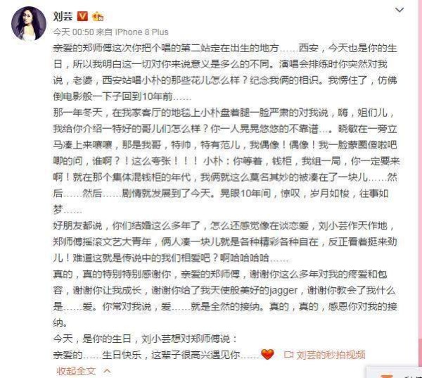 今天(10月6日)凌晨,刘芸在微博为老公郑钧 庆生,发长文怀念二人恋爱的过往:“亲爱的郑师傅,谢谢你这么多年对我的疼爱和包容,谢谢你让我成长,谢谢你给了我天使般美好的jagger......谢谢你教会了我什么是爱”。