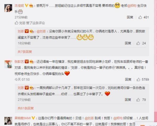 刘芸的这一番话也获得不少明星的祝福,张歆艺就回复称:还记得有一年在横店,我拉着芸姐去东阳吃麻辣小龙虾,在我车后跟郑老师的一番对话,是我有史以来听到的最美的情话:“刘芸,你就是我这一辈子的修行”啧啧啧。。。真好哇!祝郑老师生日快乐,你俩幸福到白头。