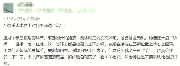 网上有消息称,在4月6日黄磊闫妮等人参加的《快乐大本营》节目中,谢娜曾对何炅说了一个“滚”字。那是在一个歌曲接唱环节,谢娜抢答却未能答出,何炅玩笑般地让她回去,而谢娜在退回去的时候,不经意地说了那个字。