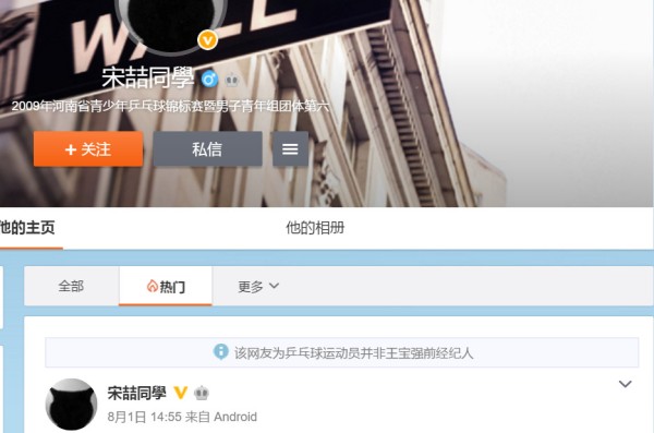 也许是因为同名躺枪的事件在微博上时有发生,所以当宋喆再次躺枪时,微博官方甚至暖心地加了提示“该网友为乒乓球运动员并非王宝强前经纪人”。