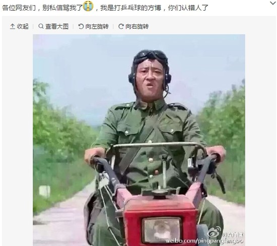 但是,国乒名将方博却因此躺枪,他的微博被许魏洲的粉丝们攻陷。无辜挨骂,方博也只能发微博去澄清,“各位网友们,别私信骂我了,我是打乒乓球的方博,你们认错人了。”方博在微博里还加了一个哭脸,配上了东北二人转演员“尼古拉斯赵四”的剧照。