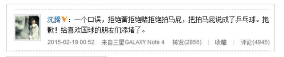 沈腾此后在微博上称这是一个口误,“拒绝黄、拒绝赌、拒绝拍马屁,把拍马屁说成了乒乓球。抱歉!给喜欢国球的朋友们添堵了。”王皓、马龙等人随后也转发了这条微博,不再对此事揪住不放。