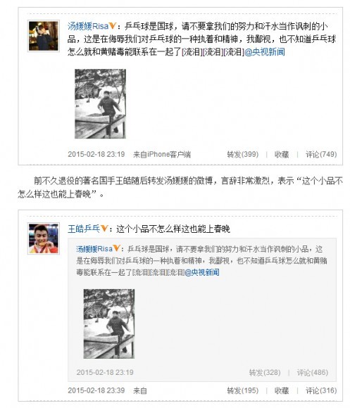 国乒的躺枪,还不只这两件事。2015年春晚沈腾和马丽主演的小品《投其所好》讽刺溜须拍马等现象,但是在台词中却提到了“拒绝黄,拒绝赌,拒绝乒乓球”的语句,招致了国乒乒坛人士的不满。已经退役的国乒名将王皓和刚刚拿下大满贯的马龙都表达了不满。