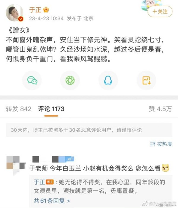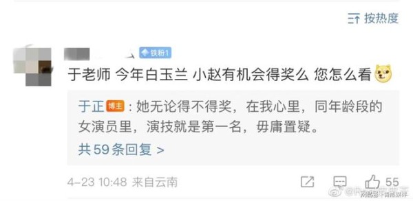 有网友评论下询问于正,赵丽颖有没有机会今年拿下白玉兰。于正称,无论赵丽颖拿不拿奖,都是他心中这个年龄段女演员里的演技第一名。