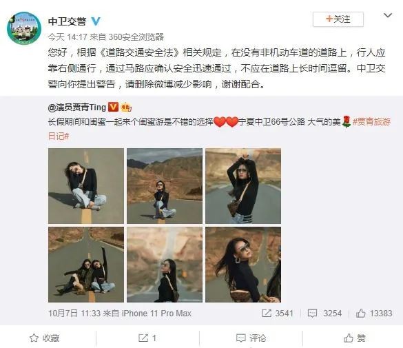 10月7日,贾青发微博晒出其与闺蜜在中卫66号公路中央拍的多张照片。中卫交警称,根据《道路交通安全法》相关规定,在没有非机动车道的道路上,行人应靠右侧通行。