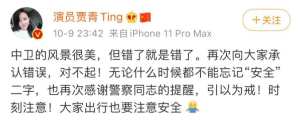 9日深夜,贾青发微博致歉,并已删除被交警警告的微博。