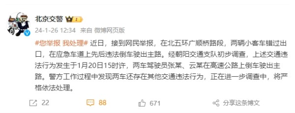 1月26日中午,北京市公安局公安交通管理局官方微博@北京交警 发布通报:近日,接到网民举报,在北五环广顺桥路段,两辆小客车错过出口,在应急车道上先后违法倒车驶出主路。经朝阳交通支队初步调查,上述交通违法行为发生于1月20日15时许,两车驾驶员张某、云某在高速公路上倒车驶出主路。警方工作过程中发现两车还存在其他交通违法行为,正在进一步调查中,将严格依法处理。