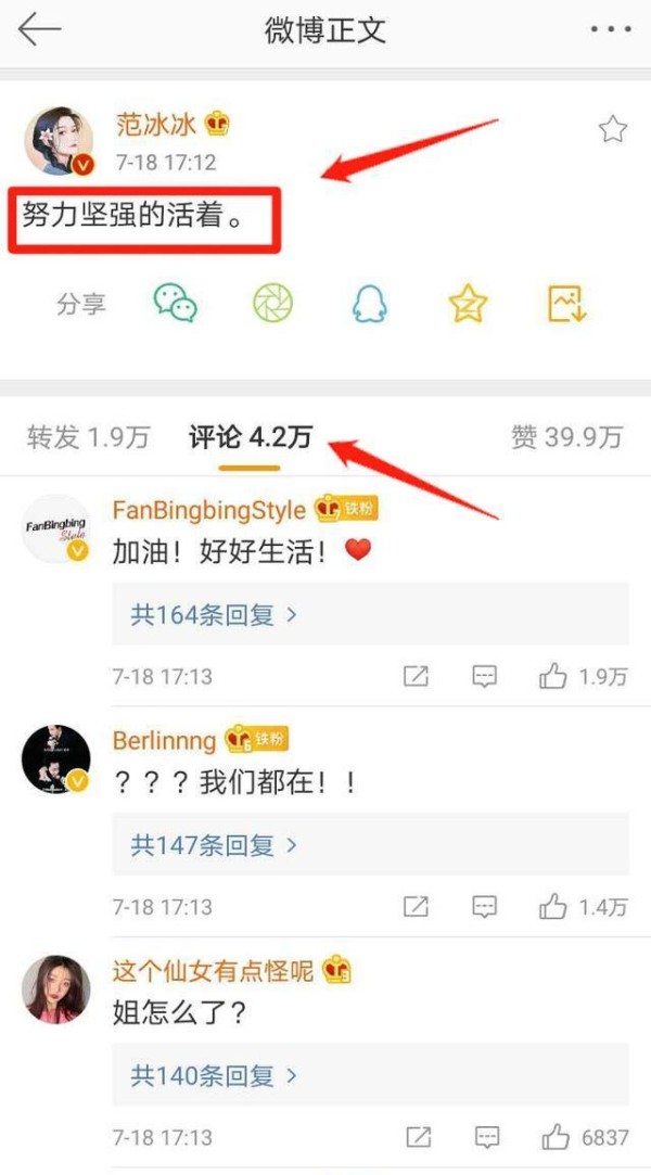 近日,明星范冰冰在微博上发了一条:努力坚强地活着。然后底下粉丝们“沸腾”了,光评论就有4.2万条,所以说至少有4.2万个网友在关心人家。