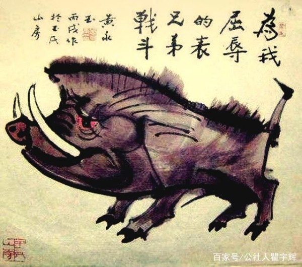 《为我屈辱的表兄弟战斗》,老顽童黄永玉画猪作品欣赏。黄永玉是一位颇具传奇色彩的人,他小时候是艺术神童,版画、油画、国画、雕塑等均无师自通。他曾是弘一法师的三个方外弟子之一,得其真传而练就了灵性十足的书法。