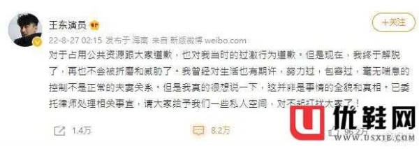 对于占用公共资源跟大家道歉,也对我当时的过激行为道歉。但是现在,我终于解脱了,再也不会被折磨和威胁了。我曾经对生活也有期许,努力过,包容过,毫无喘息的控制不是正常的夫妻关系。但是我真的很想说一下,这并非是事情的全貌和真相。已委托律师处理相关事宜,请大家给予我们一些私人空间,对不起打扰大家了!