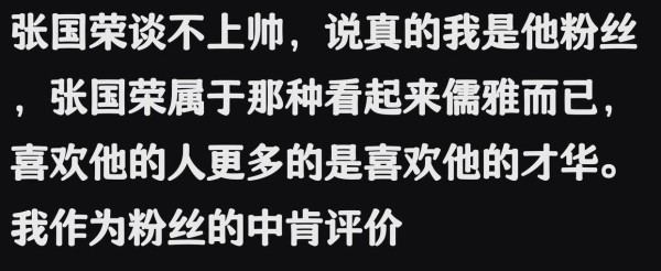 张国荣给人的感觉一向是温文尔雅,他并不以帅气著称,但那种如沐春风般的温暖却让人难以忘怀。尽管如此,用形容女性的“风华绝代”来形容他,似乎并不贴切。张国荣给人以如沐春风之感,尽管不以帅气著称,却有如女性般动人的风采。