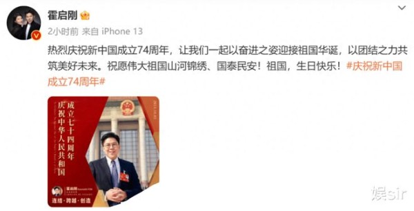 比如刚在杭州亚运会上引起热议的霍启刚,他发文写道,“让我们一起以奋进之姿迎接祖国华诞,以团结之力共筑美好未来。”