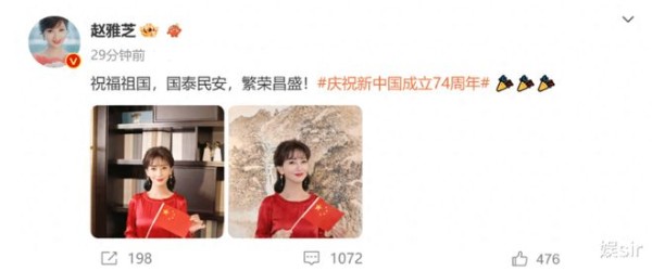 赵雅芝则晒出手拿国旗的照片,配文写道,“祝福祖国,国泰民安,繁荣昌盛。”
